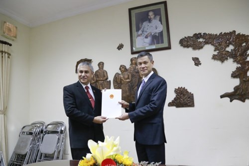 Consul General Hanif Salim (L) receives a written approval from the Vietnamese Foreign Ministry. Photo: baoquocte.vn |