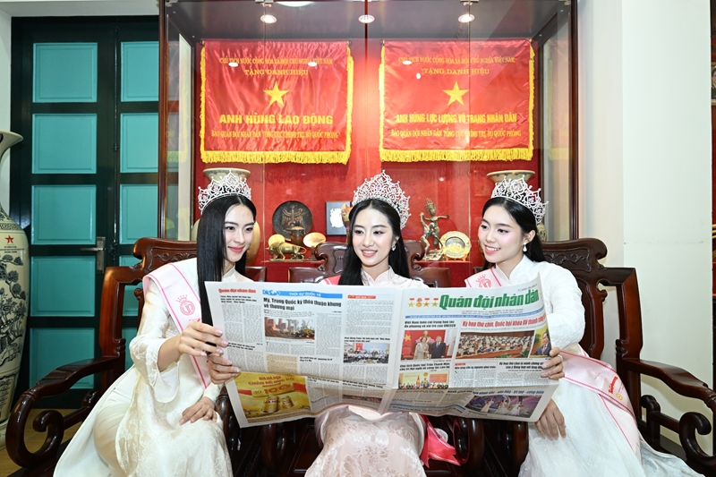 The Top 3 of Miss Vietnam 2024 reading the People’s Army Newspaper |