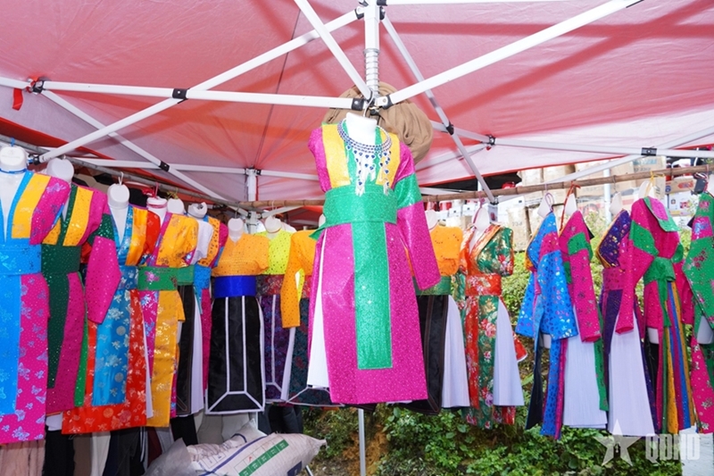 Stalls displaying brightly colored traditional costumes attract large numbers of visitors. |
