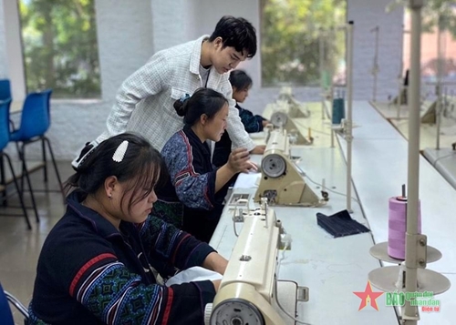 A student of the London Academy of Fashion and Design - Hanoi guides ethnic girls new techniques on sewing. |