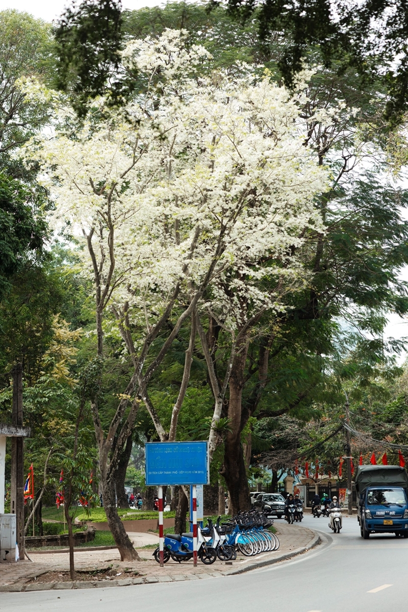 During this time, Sua flowers, known scientifically as Dalbergia tonkinensis, also begin to bloom in full. Along streets such as Thanh Nien and Hoang Hoa Tham, the trees burst into clusters of pure white blossoms, resembling small clouds floating above the streets. Many young people have likened Hanoi’s Sua blossom season to “a rain of flowers,” a spectacle that invites passersby to pause for a few moments to take in the view.