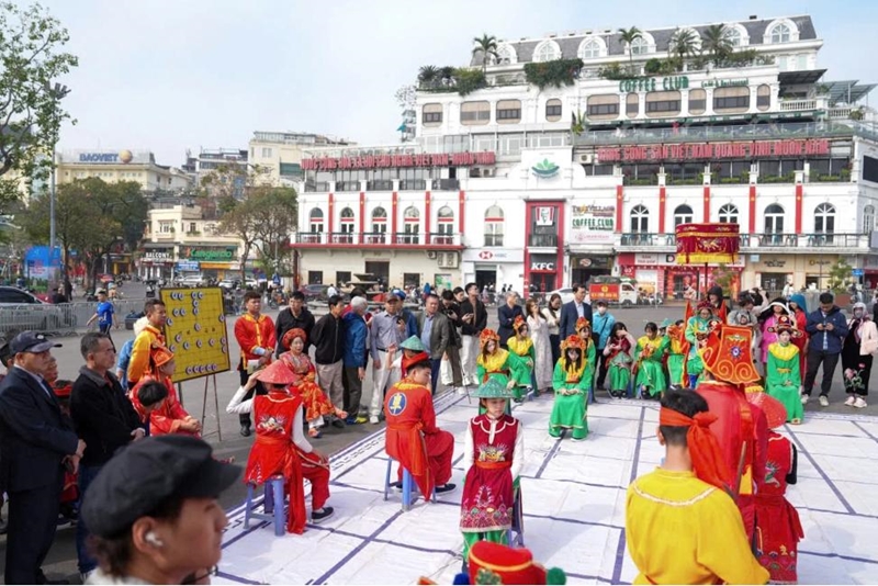 The “Human Chess – A Traditional Vietnamese Cultural Beauty” festival, hosted by the People’s Committee of Hoan Kiem ward, opened with an lion–dragon dance, conveying wishes of prosperity, good fortune and happiness. The resounding festival drums echoed through the Old Quarter, drawing enthusiastic applause from residents and visitors alike.