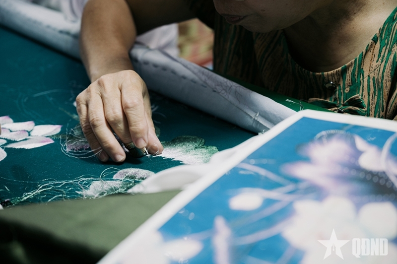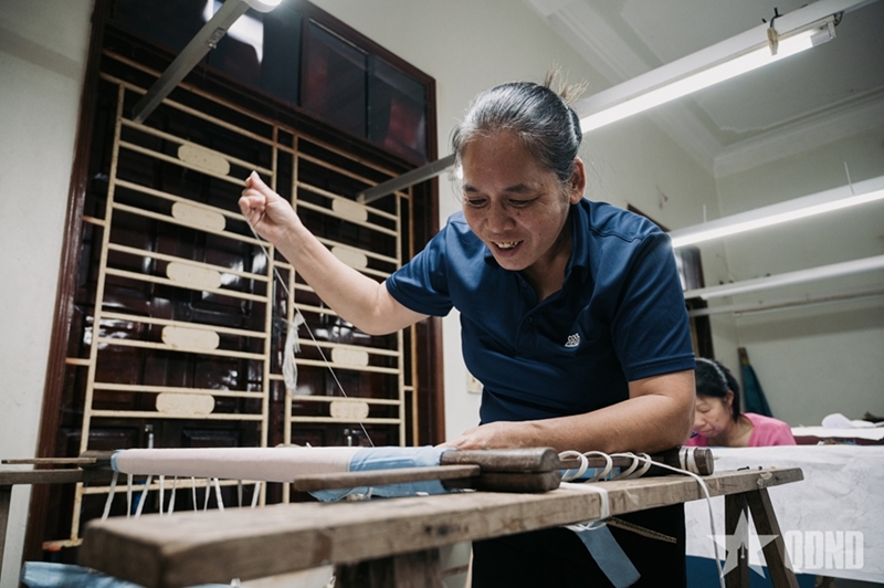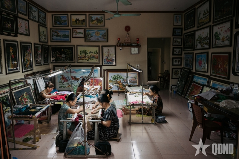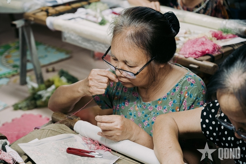 Attached to the embroidery frame since she was 14, 49-year-old Pham Thi Ve exemplifies the perseverance of Minh Lang villagers. |