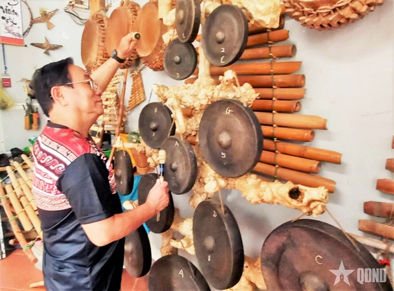 Another creation of his is a 14-piece gong set of the Jarai ethnic people, tuned to Central Highlands scales and mounted on a frame made from treated coffee wood shaped like a rong house (communal stilt house of ethnic people in the Central Highlands) roof. This allows flexible performance with both modern and traditional ensembles.