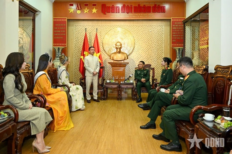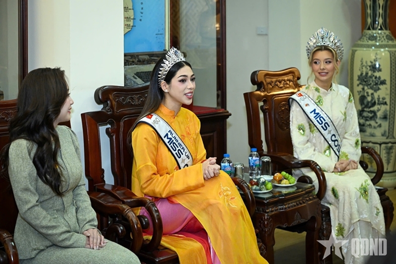 During the meeting, Senior Colonel Ngo Anh Thu, PAN’s Deputy Editor-in-Chief, who chaired the event, introduced the two beauty queens to PAN’s more than 75-year tradition and history. He noted that the newspaper is one of Vietnam’s leading press agencies, with print editions widely circulated nationwide and an online platform available in Vietnamese and five foreign-language editions, namely English, Chinese, Lao, Khmer, and Russian. The newspaper’s mission is to disseminate information across all aspects of social life, with a particular focus on national defense and security. It adheres to a humane, objective, and truthful editorial philosophy, accompanying the development of the Vietnam People’s Army and the country as a whole.
