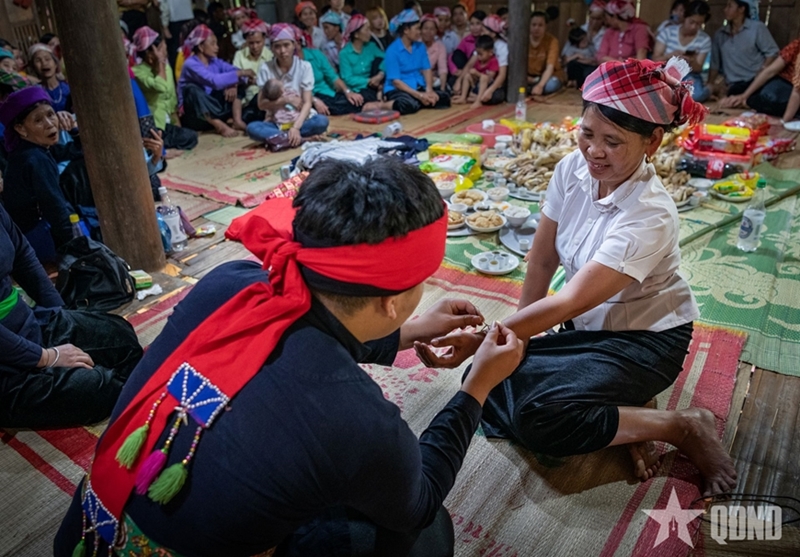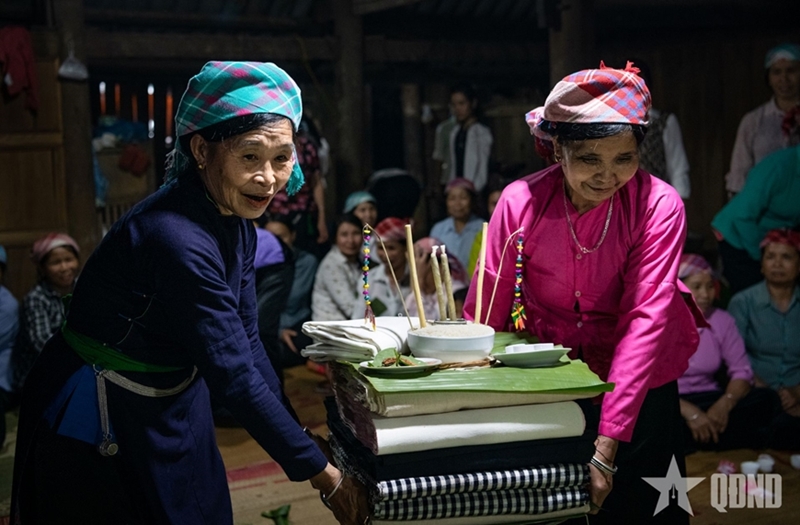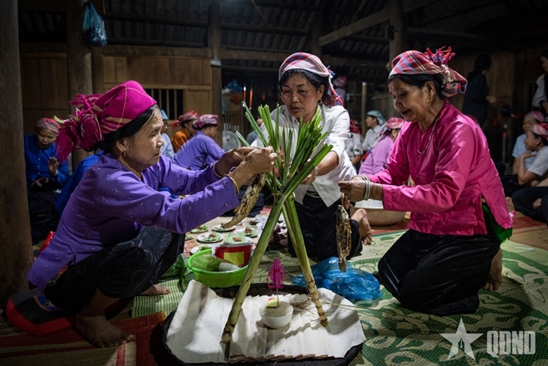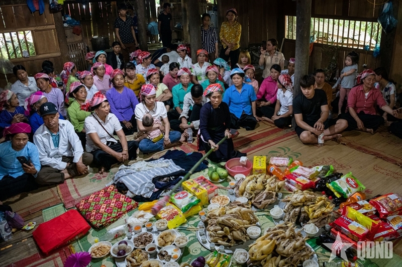 The Then Khoan ritual is conducted over the course of one full day and night to pray for people over 50 to have good health and longevity. It is presided over by a Then master, accompanied by assistants and a dance troupe. The most distinctive offering is a symbolic “khoan house” with 12 compartments, crafted from banana leaves and bamboo, along with offerings such as pork, chicken, fish, duck, and fruit. Essential elements of the ritual include a tray of cloth used to “extend fate,” rattan cords symbolizing the extension of lifespan for the ritual recipient, and the tying of wrist threads to pray for peace and well-being for all participants.