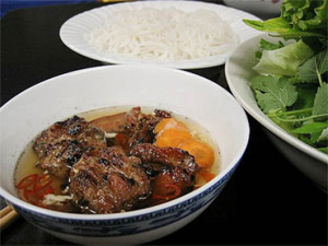 Central to it are the tiny grilled cha vien (pork patties) or cha mieng (fatty pork slices) or both.