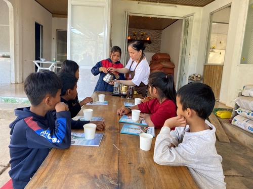 To realize that goal, the company has provided basic knowledge related to coffee to the locals. Meanwhile, it has also educated them to introduce products to customers, thereby the coffee class has been opened with 10 Van Kieu ethnic minority students, aged from 8 to 15.