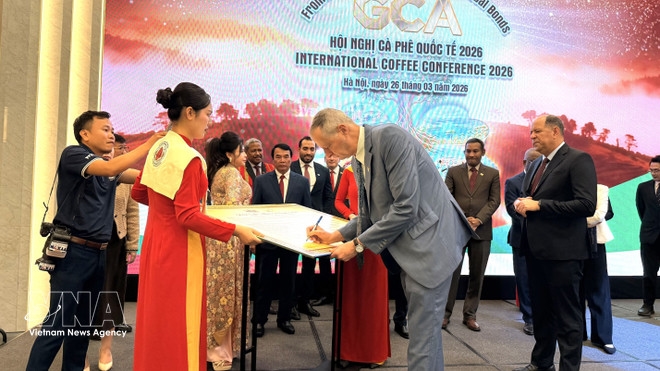 Ambassadors and representatives of diplomatic missions in Vietnam take part in a signing ceremony at the International Coffee Conference 2026 in Hanoi |