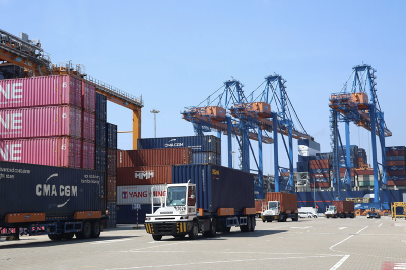 Container trucks operate at Gemalink International Port, part of the Cai Mep Port system in Ho Chi Minh City. |