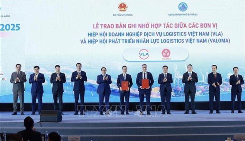 Prime Minister Pham Minh Chinh (fifth, left) witnesses the exchange of Memorandum of Understanding on cooperation between agencies and units at the Vietnam Logistics Forum 2025 in the central city of Da Nang on November 29, 2025. |
