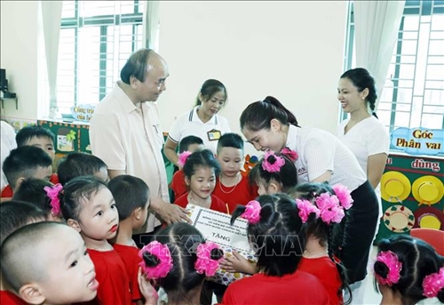 President Nguyen Xuan Phuc presents gifts to children of the plant's workers. |