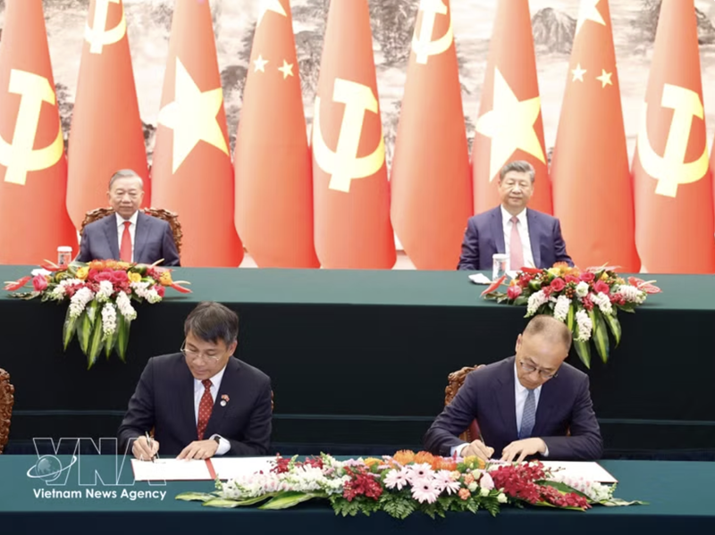 General Secretary of the Communist Party of Vietnam Central Committee and President of Vietnam To Lam (left, back) and his Chinese counterpart Xi Jinping witness the signing of cooperation agreements between the two countries on April 15, 2026. |