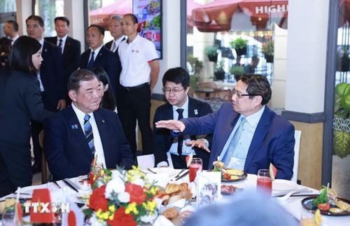 Prime Minister Pham Minh Chinh (right) and Japanese counterpart Ishiba Shigeru have breakfast and enjoy Vietnamese coffee together on April 29 |