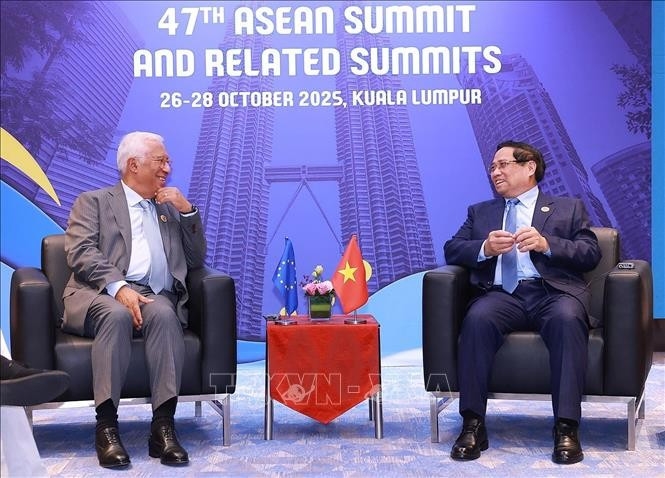 Prime Minister Pham Minh Chinh (right) meets with President of the European Council Antonio Costa to discuss bilateral cooperation and issues of mutual concerns on October 27, 2025 on the sidelines of the 47th ASEAN Summit and Related Summits in Kuala Lumpur, Malaysia. |