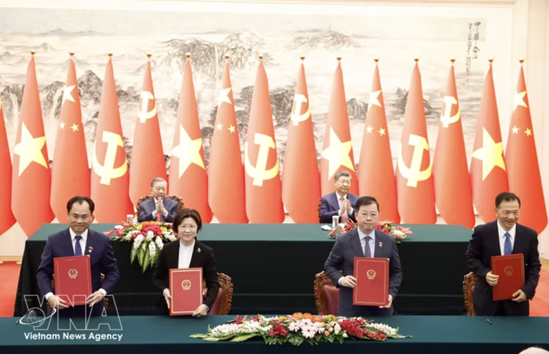 Other documents include an MoU between the Organization Commission of the CPV Central Committee and the CPC Central Committee’s Organization Commission; an MoU between the Ministry of Construction of Vietnam, and the National Development and Reform Commission (NDRC) of China on implementing railway training cooperation to enhance capacity of Vietnamese railway personnel; an MoU on vocational education cooperation between the Ministry of Education and Training of Vietnam and the Ministry of Education of China; an MoU on cooperation in information technology and digital transformation between the Ministry of Science and Technology of Vietnam and the Ministry of Industry and Information Technology of China; an MoU on cooperation between the ministries of Justice of Vietnam and China on strengthening partnership in resolving civil and commercial disputes among border residents.