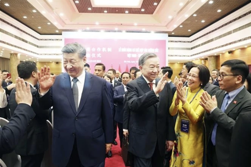 General Secretary of the Communist Party of China (CPC) Central Committee and President of China Xi Jinping (left), General Secretary of the Communist Party of Vietnam Central Committee To Lam (right), and delegates at the Vietnam-China people’s friendly meeting |