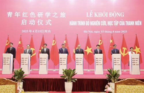 Party General Secretary To Lam (fourth, right), State President Luong Cuong (third, right) and General Secretary of the Communist Party of China Central Committee and President of China Xi Jinping (fourth, left) and delegates launch the “Red Journey: Youth’s researches and studies” project in Hanoi on April 15 |