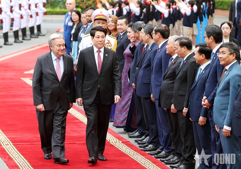 Vietnamese President Luong Cuong (right) hosts the official welcome ceremony for U.N. Secretary-General Antonio Guterres in Hanoi on October 24. (Photo: qdnd.vn) |