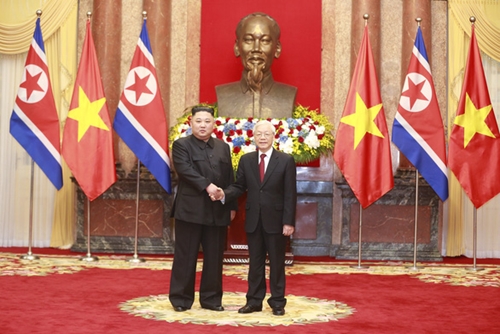 Party General Secretary and President Nguyen Phu Trong welcomes General Secretary of the WPK Kim Jong-un during Kim Jong-un's visit to Vietnam in March 2019 |