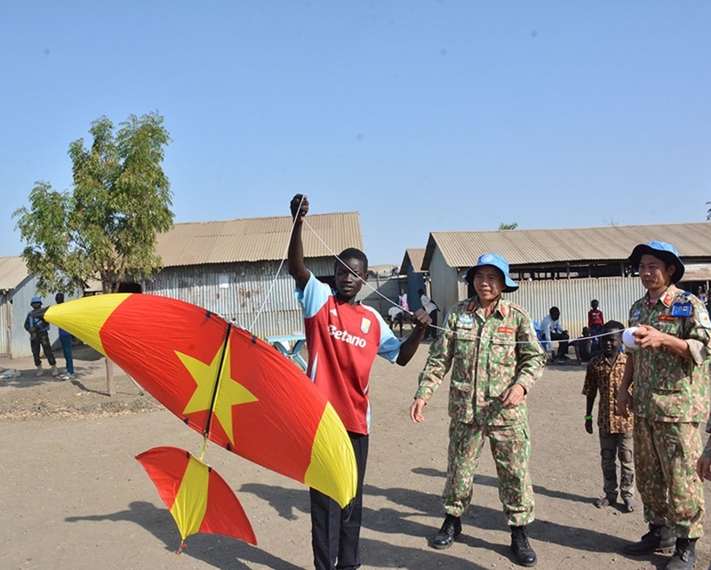 Beyond supporting education, Vietnamese peacekeepers also brought footballs and brand-new kites. These seemingly ordinary gifts are considered luxuries in a country still struggling with poverty and conflict, where many families still struggle to secure daily meals. Watching the excited faces chasing a rolling ball across a dirt field, running after kites swaying in the wind, I suddenly realized that if peacekeeping is a grand mission, then peace can sometimes be as simple as a child’s smile when receiving a gift.