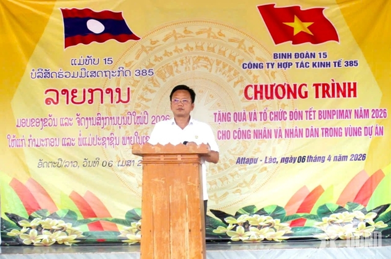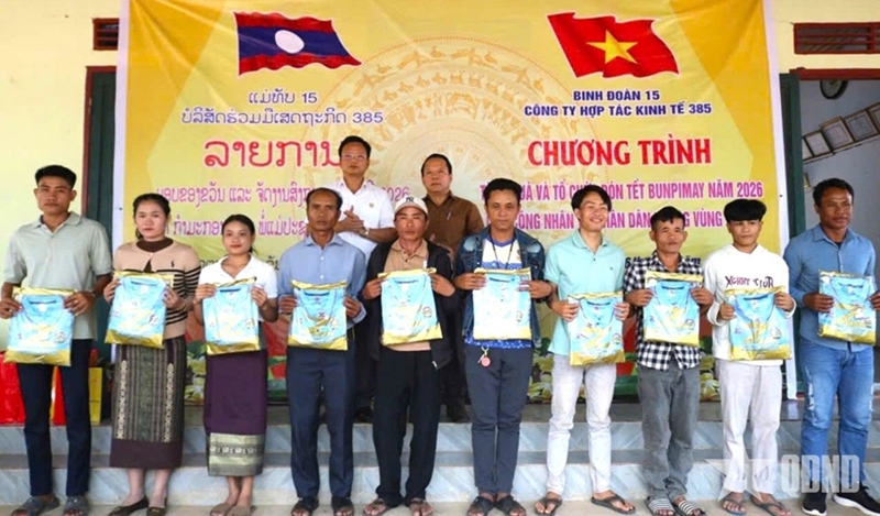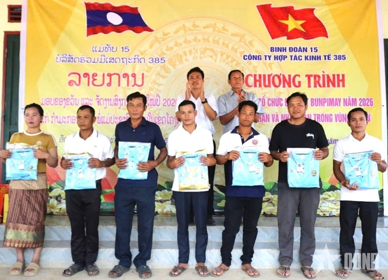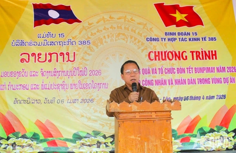 PANO - From April 6 to 9 in Attapeu province (Laos), Economic Cooperation Company 385 (under Corps 15) visited, presented gifts, and celebrated the Bunpimay traditional New Year 2026 with local workers and residents.