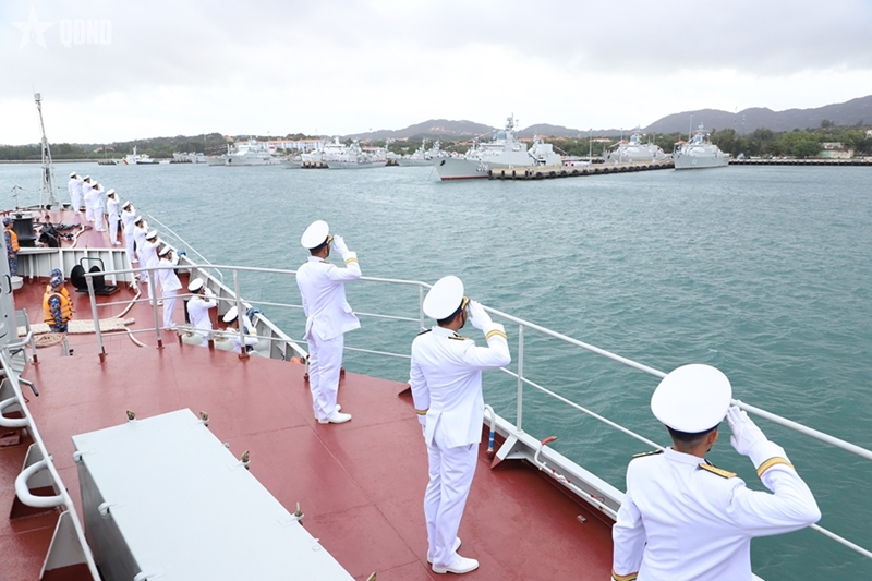 The delegation and the crew of the 015-Tran Hung Dao salute the port upon arrival at Cam Ranh Military Port. |