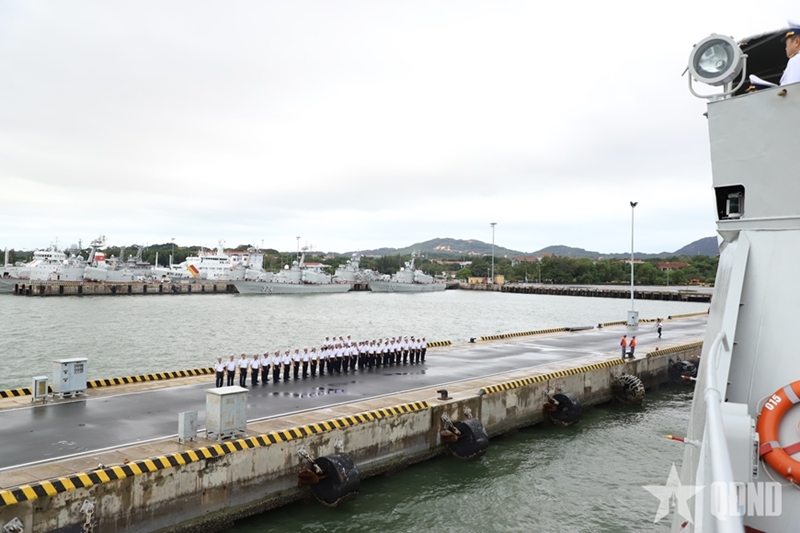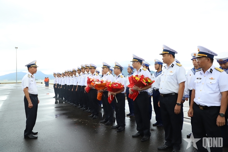 Officers and sailors of frigate 015-Tran Hung Dao bid farewell to the port. |