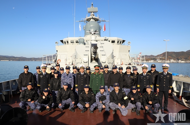 Officers and sailors of JS Tenryu visit Frigate 015–Tran Hung Dao and take commemorative photos. |