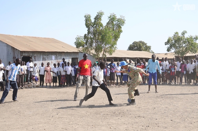 A friendly football match between Vietnamese “blue-beret” soldiers and the school’s teachers and students. |