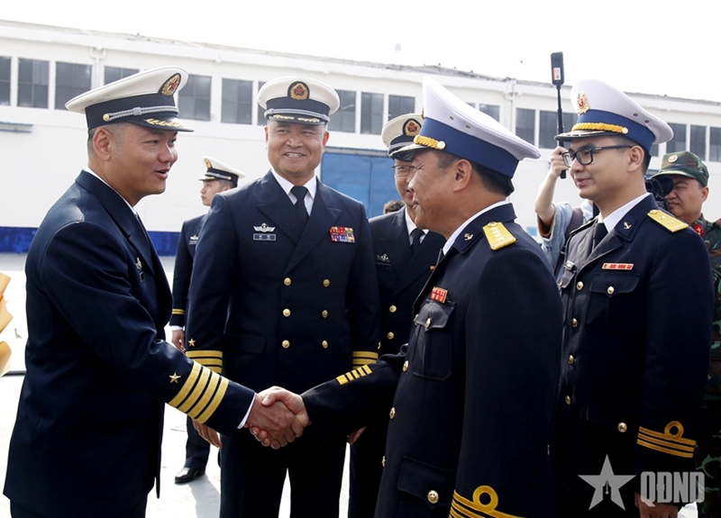 Leaders of Guangzhou Base, together with Chinese naval officers, and sailors welcome the Vietnamese delegation at the pier. |