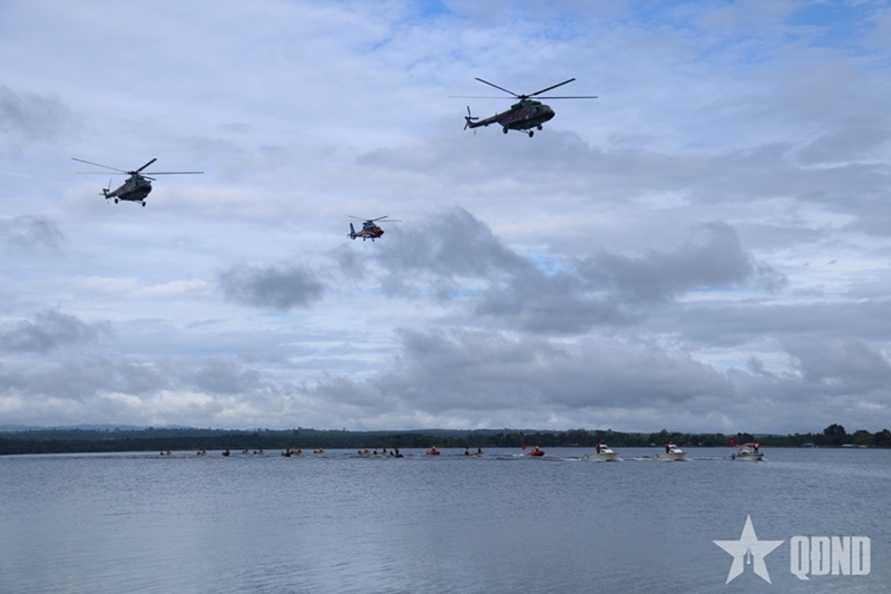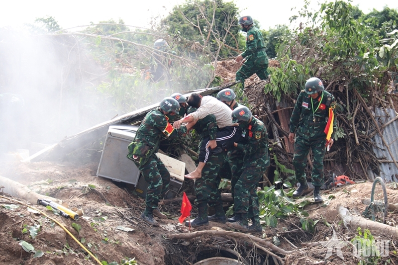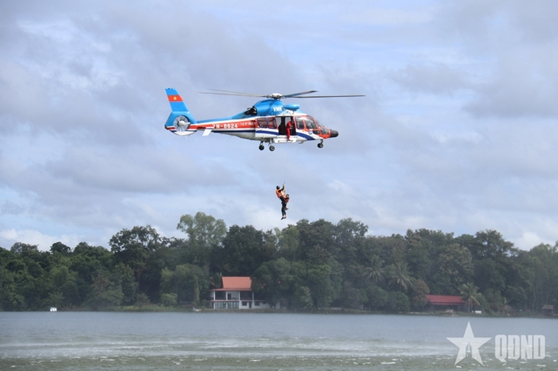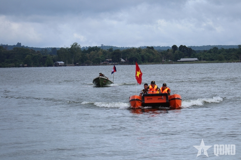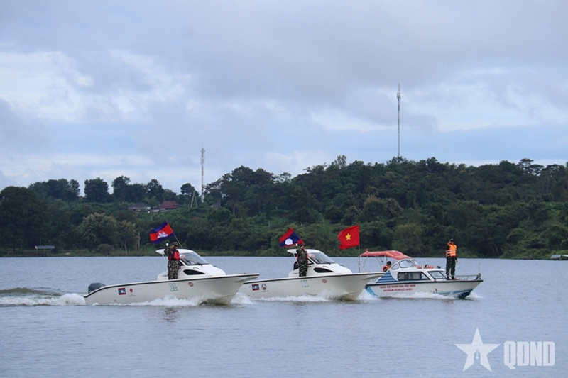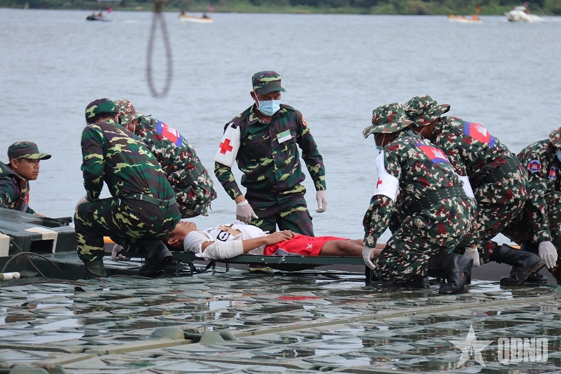 In the flood search and rescue scenario, the armed forces of the three countries carried out patrols and search missions in affected areas using boats and unmanned aerial vehicles. They practiced rescuing and assisting people trapped in houses, on trees, or isolated areas, as well as recovering and treating victims swept away by floodwaters. Emergency medical teams provided first aid before transferring the injured to field hospitals for further treatment.