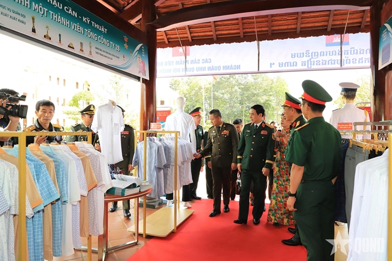 Vietnamese Minister of National Defense General Phan Van Giang, his Cambodian counterpart Gen. Tea Seiha, who is also Deputy Prime Minister of Cambodia, and other delegates admire products by Corporation 28 under the General Department of Logistics-Technical Services (GDLT). |