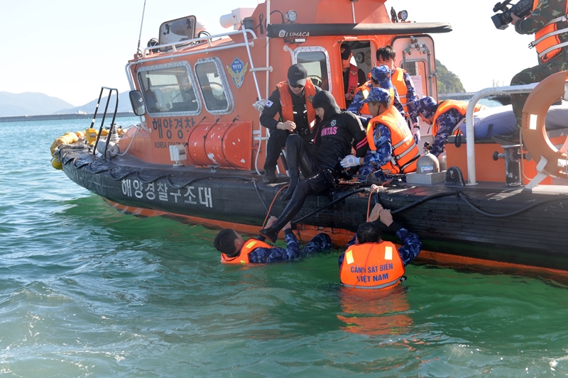 Vietnam Coast Guard soldiers conduct underwater search-and-rescue training with personnel of the Korea Coast Guard in November 2024. |