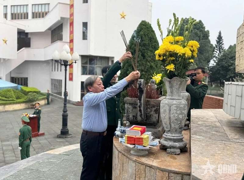 Gen. Khoa offers incense at the Monument to the Heroic Martyrs of Army Corps 12 at the Corps’ Headquarters in Trung Son ward, Ninh Binh province. |