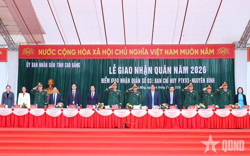 PANO - Defense Minister General Phan Van Giang attended the 2026 military handover and enlistment ceremony held at the Defensive Area Command Region 3-Thong Nhat, Cao Bang province on March 4.