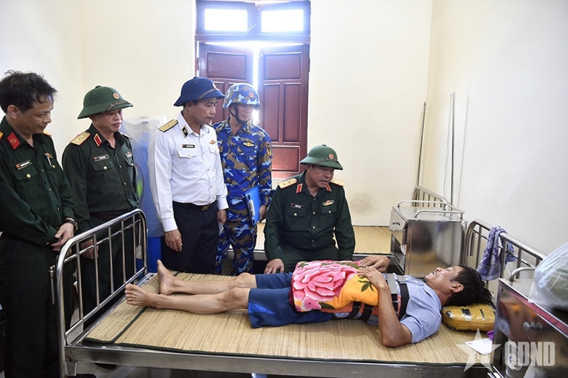 The delegation visiting and encouraging a civilian under treatment at the infirmary on Truong Sa Dong (Central London Reef) Island. |