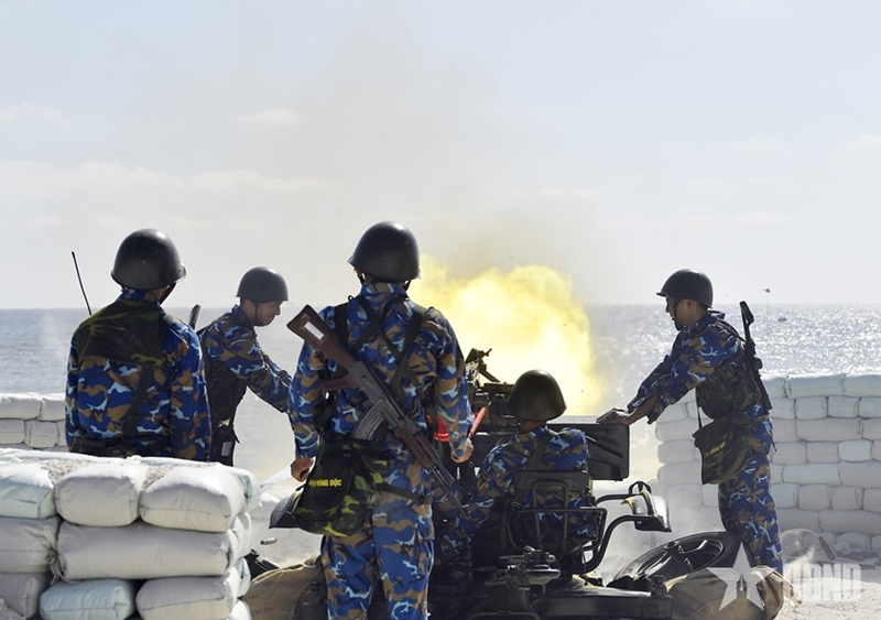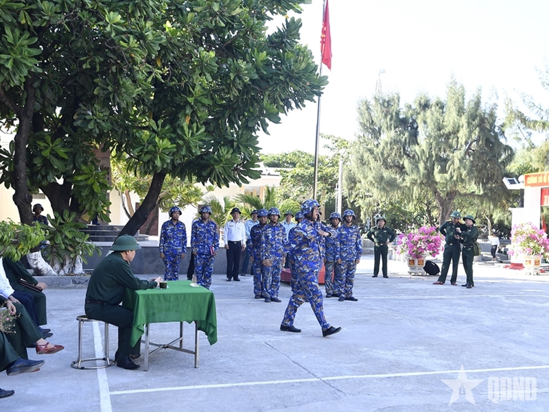 The delegation’s head reviewing formation drills with officers and soldiers on Sinh Ton Dong (Grierson Reef) Island |