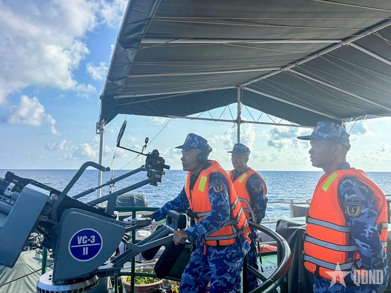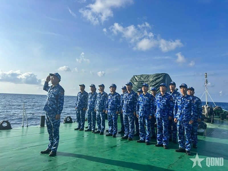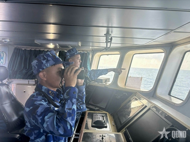 At dawn, when the eastern sky began to glow with bright red colors, and on the upper deck, the national flag flaps briskly in the early morning breeze, all officers and crew members begin a new day with a solemn flag-raising ceremony. This is followed by professional training, record-keeping, and drills on handling realistic scenarios such as patrol, inspection, and control of vessels showing signs of violations, along with combat readiness exercises for air and maritime situations.