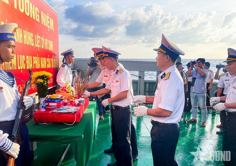 From early morning, the memorial ceremony was prepared with care and solemnity by the delegation and the crew of the Truong Sa 19. On the ship’s deck, officers, soldiers, and delegates stood neatly in line before a wreath shaped like the national flag, bearing the inscription “Eternal gratitude to the heroic martyrs.”