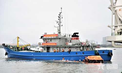 Da Nang city’s standing militia squadron practice rescuing people in distress at sea. |