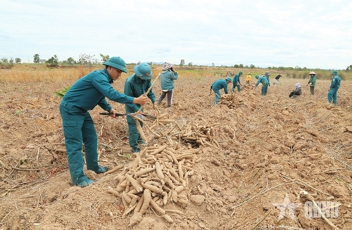 Personnel from the standing militia checkpoint of Ia Lop commune, Ea Sup district, Dak Lak province supports people in harvesting crops. |