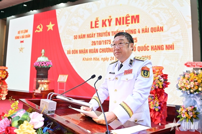Addressing the ceremony, Senior Lieutenant General Pham Hoai Nam requested the Naval Region 4 Command to maintain a high level of combat readiness, remain vigilant, and accurately assess and forecast the situation to effectively advise the Party, State, Ministry of National Defense, and the Naval Service. He emphasized the need to renew training content, methods, and thinking to ensure practicality and efficiency, focusing on mastering modern weapons and equipment.