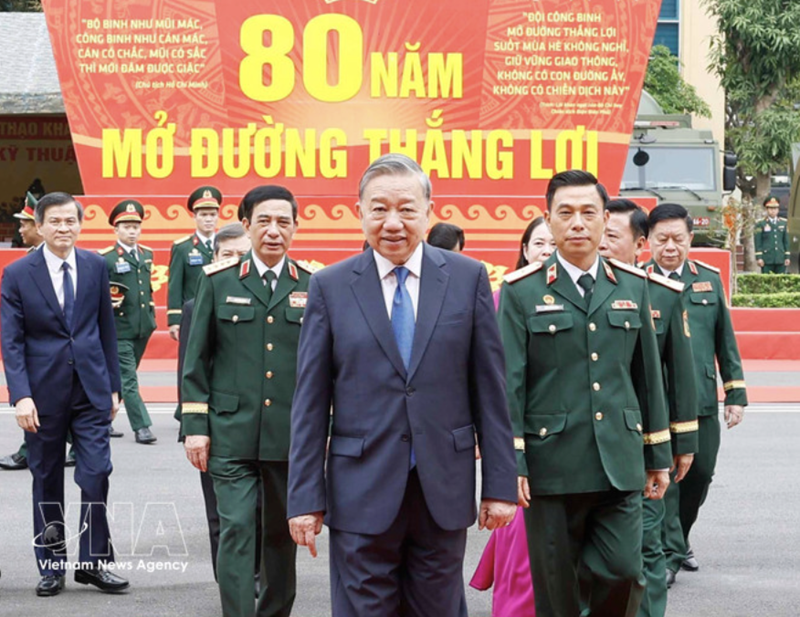 General Secretary To Lam, in his speech, extended congratulations and best wishes to incumbent and former leaders of Party Central Committee agencies, heroic Vietnamese mothers, Heroes of the People’s Armed Forces, Heroes of Labor; generals, officers, veterans, wounded soldiers, families of martyrs, and all officers and soldiers of the corps.
