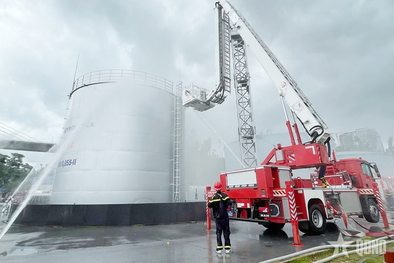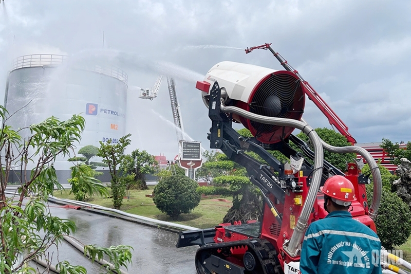 According to the simulated scenario, a Flycam drone flying in the airspace above Petrolimex Quang Ninh's oil storage facility lost control and collided with the vent valve of an oil tank. The incident generated sparks, igniting a fire and causing an explosion of the oil vapor mixture, which damaged a section of the tank’s roof and caused flames on the tank’s surface. The explosion destroyed the cooling water spray system around the tank wall and the fixed foam system, rendering them inoperable.