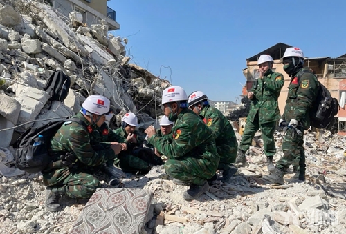 Vietnam People’s Army brightens the qualities of Uncle Ho’s soldiers while performing international mission in peace-time. In photo: Military engineers and service dogs from the Vietnamese rescue forces search for earthquake victims in Antakya, the capital of Hatay province, Turkey in February 2023 (Photo: Van Hieu) |