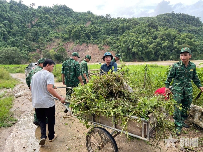 In the remote Keng Du commune, home to the Kho Mu ethnic group, floods severely damaged roads, houses, and crops. The Keng Du Border Post coordinated with local authorities to send teams to each village, assisting residents in cleaning up, repairing homes, and resuming production. The unit also cooperated with the health sector to provide free medical check-ups and medicines for the elderly and children. Soldiers prepared gifts, such as clothing, notebooks, and pens, for students at border schools.