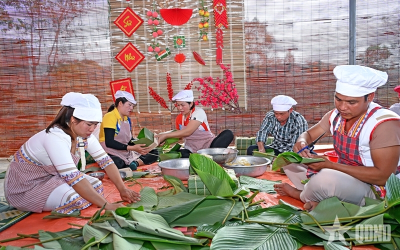 From early morning, the program unfolded in a lively atmosphere with a “Banh chung” (square glutinous rice cake) making competition, featuring seven teams composed of officers, defense workers, employees of Defense-Economic Unit 78, and ethnic people living in the area.