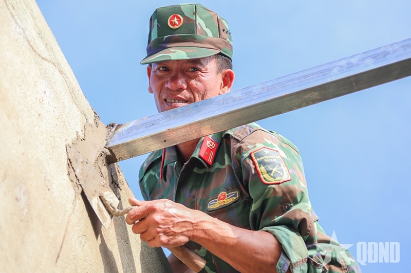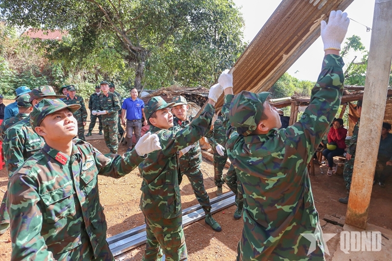 Not only “excel in military duties,” the troops also join hands with local authorities to re-roof a house for the family of K’Dung, a near-poor household in Cat Tien 3 commune. |