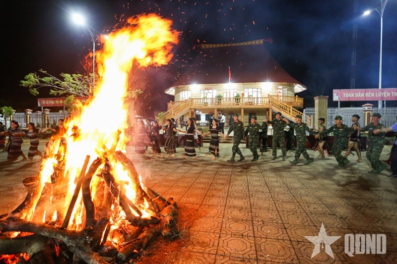 A glowing campfire night deep in the forest, with the resonant sounds of the gongs and drums, as soldiers and Ma villagers get together, further strengthening military–civilian ties. |